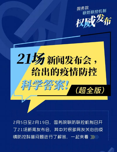 2月5日至2月19日,國(guó)務(wù)院聯(lián)防聯(lián)控機(jī)制召開了21場(chǎng)新聞發(fā)布會(huì),其中對(duì)很多網(wǎng)友關(guān)心的疫情防控科普問(wèn)題進(jìn)行了解答,一起來(lái)看。